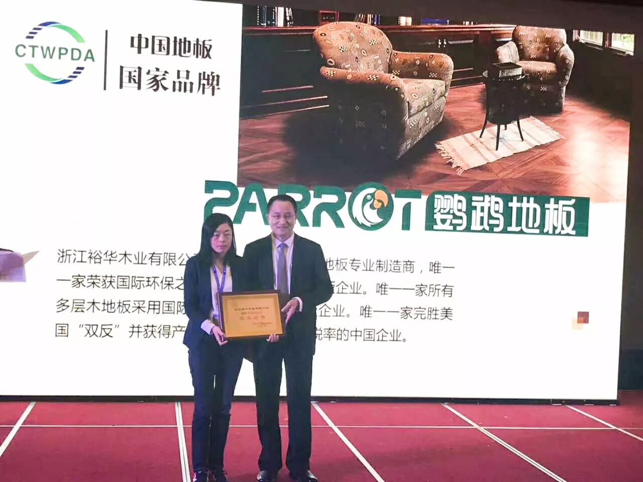 11月1日,裕华木业(鹦鹉地板)受邀出席2017世界木地板大会暨南太湖论坛,并获中国木材与木制品流通协会授予“中国地板国家品牌”荣誉。